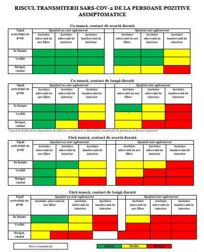 INSP a grupat scenariile de transmitere a virusului pe trei categorii de risc: scăzut, mediu sau ridicat.