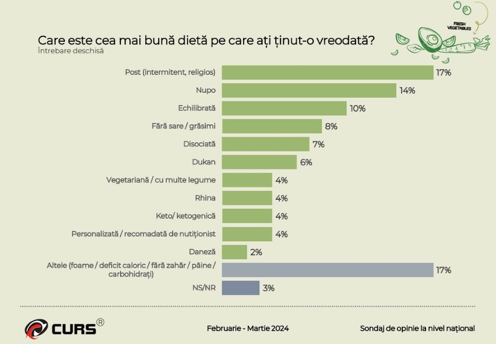 Sondajul indică o creștere semnificativă a aderării la regimuri alimentare echilibrate nutrițional, astfel că în anul 2023, 17% dintre români au declarat că au ținut dietă, iar ca opțiuni au preferat postul / intermitent sau religios (17%) și dieta Nupo (14%).