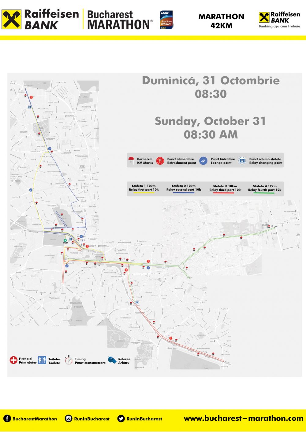 Cursele de Maraton (42km), Semimaraton (21 km), Ștafetă, start la ora 08:30 Traseu: START Bulevardul Libertății – dreapta Splaiul Independenței, Piața Națiunile Unite, dreapta pe Bulevardul Națiunile Unite, stânga Bulevardul Libertății, stânga bretea Piața Constituției (Parchet General), dreapta Bulevardul Unirii până la alveola dintre Bulevardul Mircea Vodă și Bulevardul Nerva Traian (întoarcere pe sensul celălalt înainte de intersecție – la trecerea pentru pietoni), retur Bulevardul Unirii – dreapta Bulevardul I.C.Brătianu, Piața Unirii, stânga Strada Halelor, continuare Splaiul Independenței până la Pod B.P Hașdeu, dreapta Strada Vasile Pârvan, continuare Strada Berzei, continuare Strada Buzești, dreapta bretea Piața Victoriei, stânga Șoseaua Pavel D. Kiseleff până în apropiere de Piața Arcului de Triumf, retur pe Șoseaua Pavel D. Kiseleff până la Piața Victoriei, continuare Calea Victoriei, dreapta Strada Știrbei Vodă, stânga Strada Ion Câmpineanu, dreapta Calea Victoriei, dreapta Bulevardul Regina Elisabeta, dreapta aleea centrală din Parcul Cișmigiu – întoarcere în parc și retur în Bulevardul Regina Elisabeta, continuare Bulevardul Mihail Kogălniceanu până la intersecția cu Strada Vasile Pârvan (întoarcere înainte de intersecție), retur până la Calea Victoriei, dreapta pe Calea Victoriei, dreapta pe Splaiul Independenței până la Pod B.P.Hașdeu (întoarcere pe sensul celălalt, pe pod, fără a afecta traficul auto), stânga Splaiul Independenței, Piața Națiunile Unite, dreapta Bulevardul Națiunile Unite, stânga Bulevardul Libertății, Piața Constituției, sosire pentru semimaraton, continuare proba de 42 km & ștafetă, Bulevardul Libertății până la Piața Regina Maria, întoarcere 180 grade, continuare Bulevardul Libertății, dreapta bretea Piața Constituției (Parchet General), dreapta Bulevardul Unirii, dreapta Bulevardul Mircea Vodă până la Pod Timpuri Noi, stânga Splaiul Unirii (malul stâng al cursului râului) – întoarcere înainte de intersecția cu Calea Vitan, retur pe Splaiul Unirii, dreapta Bulevardul Mircea Vodă, dreapta Bulevardul Unirii, Piața Alba Iulia, dreapta Bulevardul Burebista, întoarcere înainte de intersecția cu strada Traian Popovici, continuare pe Bulevardul Burebista, Piața Alba Iulia, dreapta Bulevardul Decebal, Piața Hurmuzachi, Bulevardul Basarabia, întoarcere înainte de intersecția cu Bulevardul Chișinău, continuare Bulevardul Basarabia, Piața Hurmuzachi, Bulevardul Decebal, Piața Alba Iulia, dreapta Bulevardul Unirii, dreapta bretea Piața Constituției, stânga Bulevardul Libertății, SOSIRE.